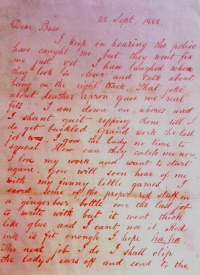 I keep on hearing the police have caught me but they wont fix me just yet. I have laughed when they look so clever and talk about being on the right track. That joke about Leather Apron gave me real fits. I am down on whores and I shant quit ripping them till I do get buckled. Grand work the last job was. I gave the lady no time to squeal. How can they catch me now. I love my work and want to start again. You will soon hear of me with my funny little games. I saved some of the proper red stuff in a ginger beer bottle over the last job to write with but it went thick like glue and I cant use it. Red ink is fit enough I hope ha. ha. The next job I do I shall clip the ladys ears off and send to the police officers just for jolly wouldn't you. Keep this letter back till I do a bit more work, then give it out straight. My knife's so nice and sharp I want to get to work right away if I get a chance. Good Luck.